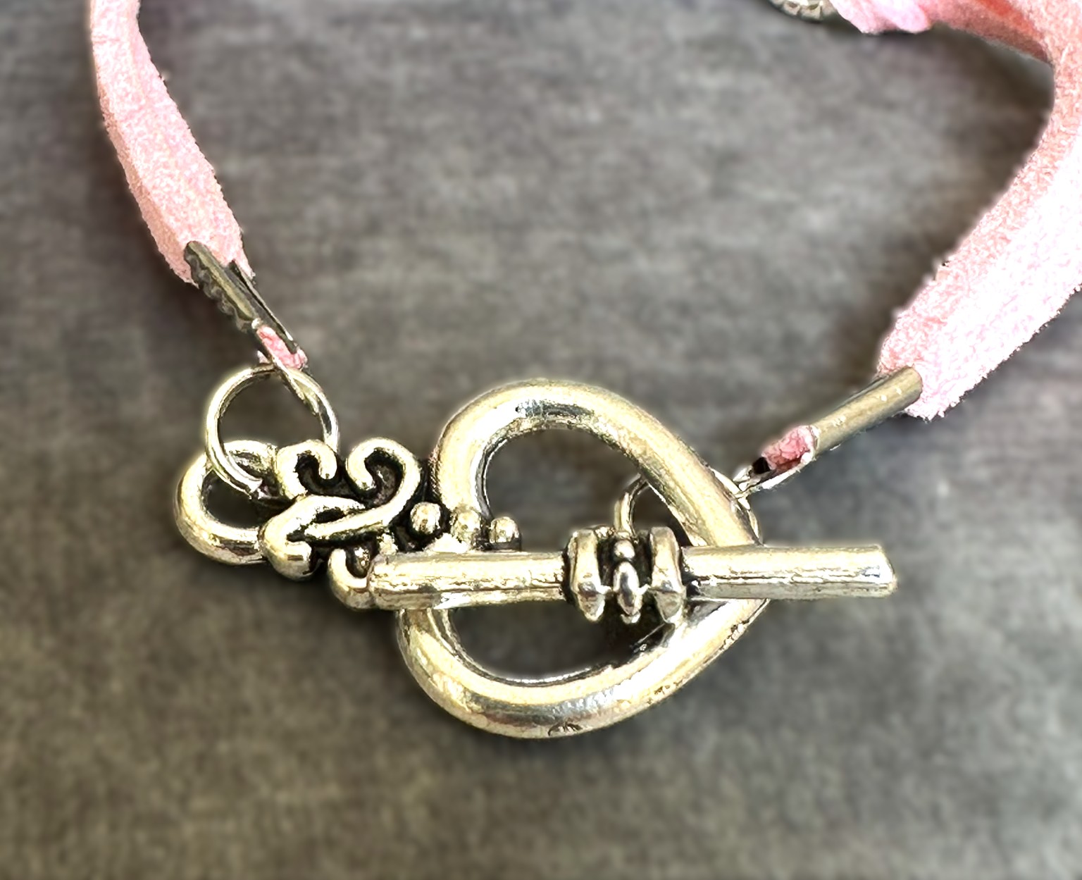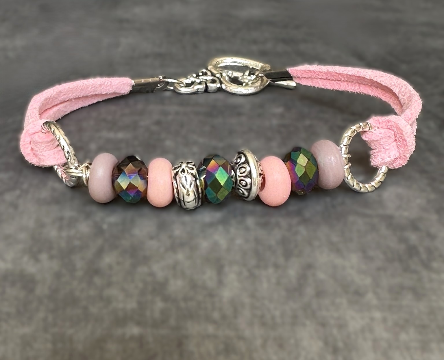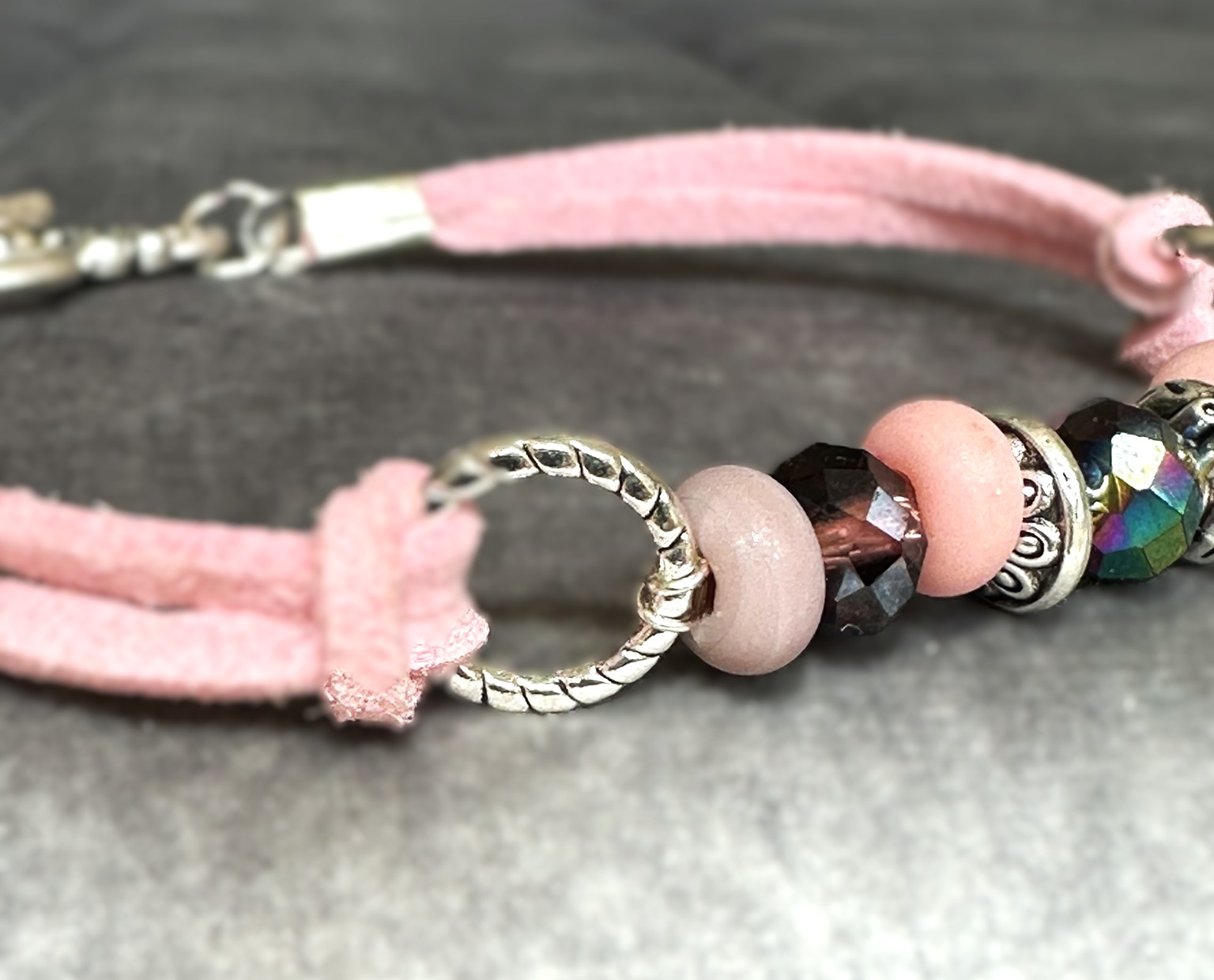 Babyroze (faux) suede armbandje met een inzetstuk van roze, lila, zilverkleurige en paars flonkerend gefacetteerde kralen.