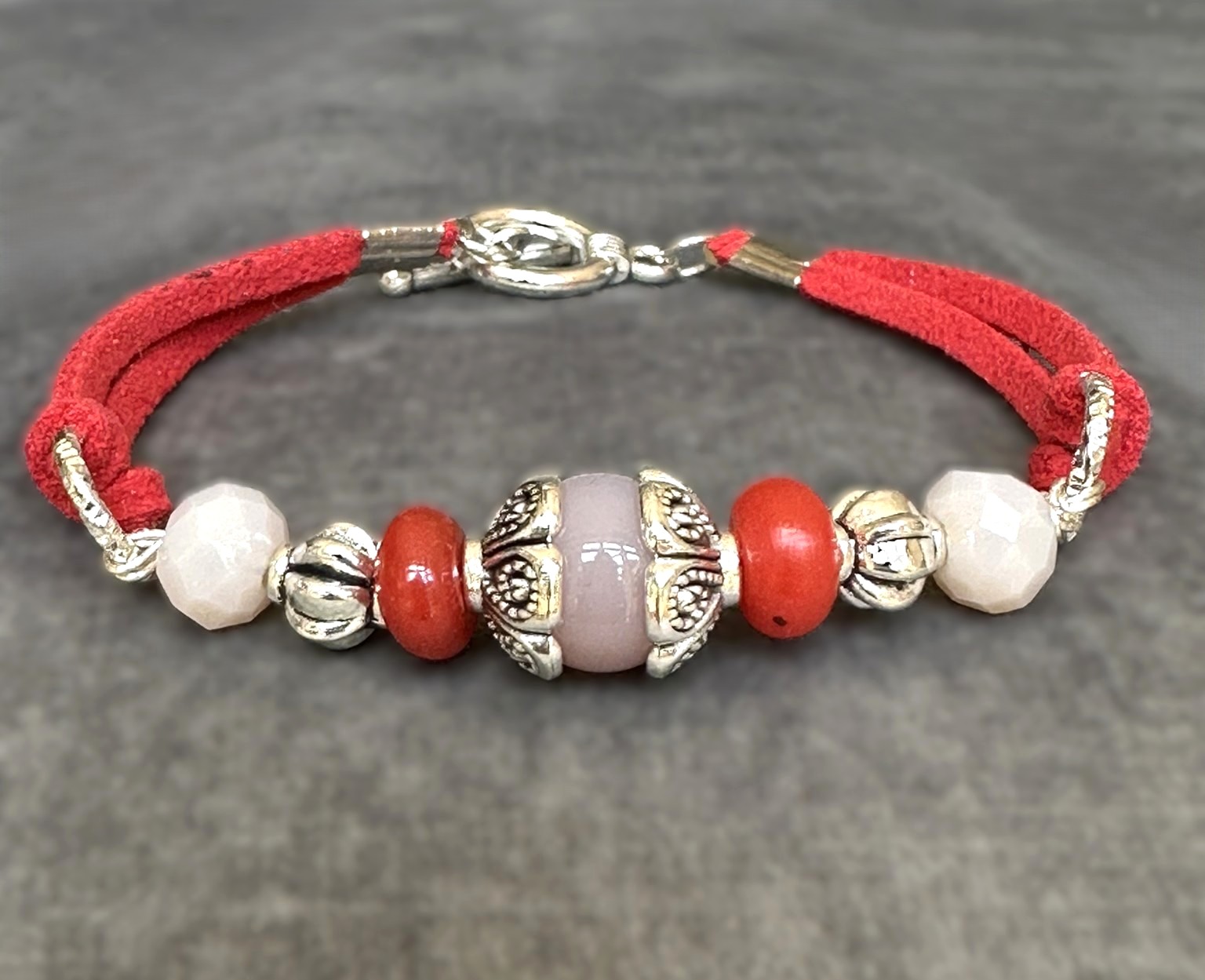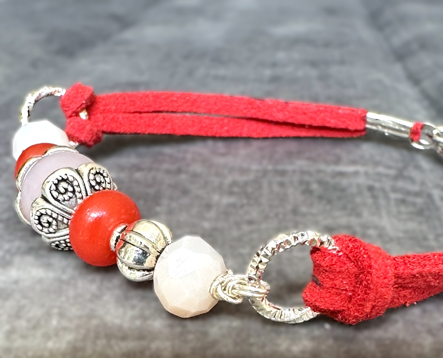 Rood (faux) suede armbandje met een fleurig inzetstuk van zachtroze, rode en zilveren kralen.