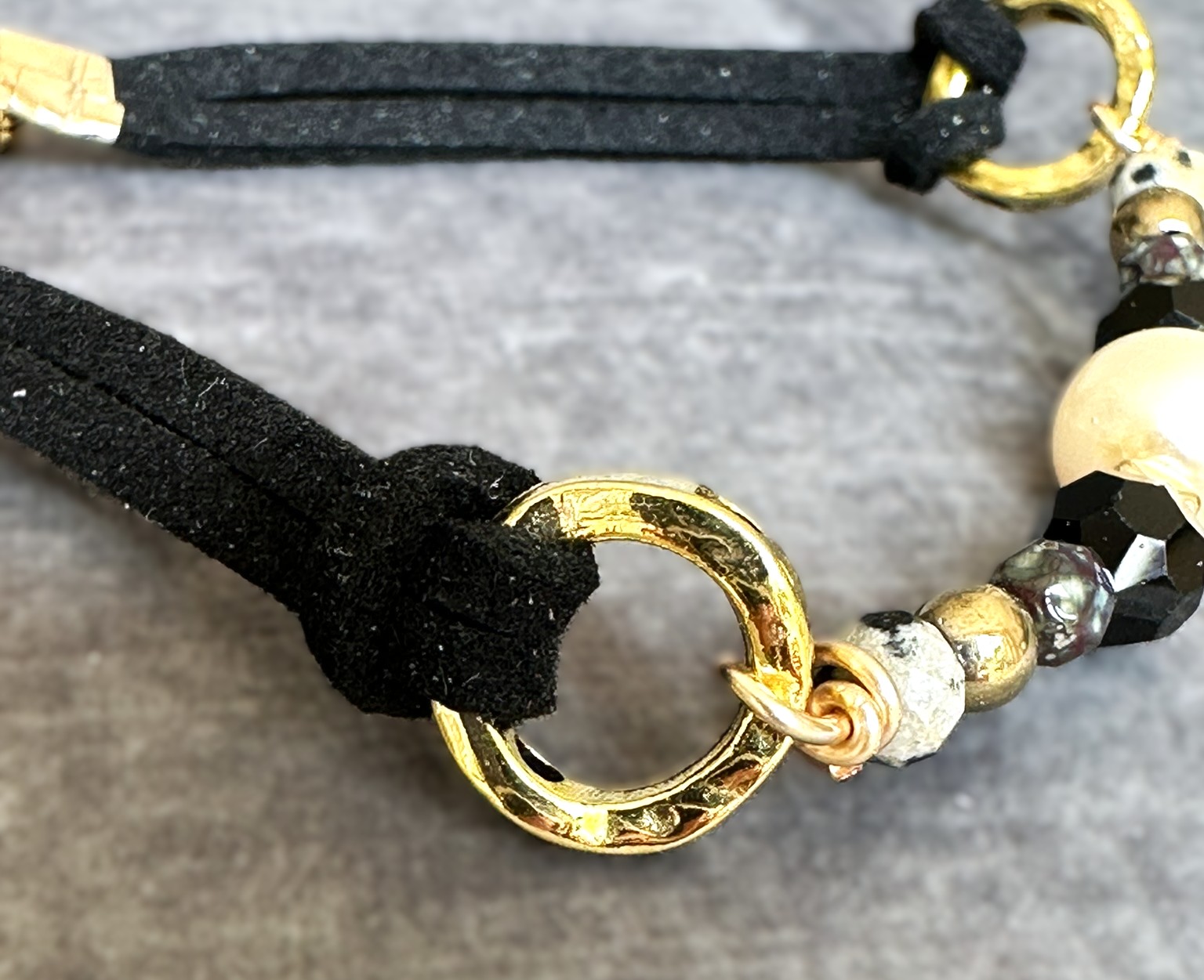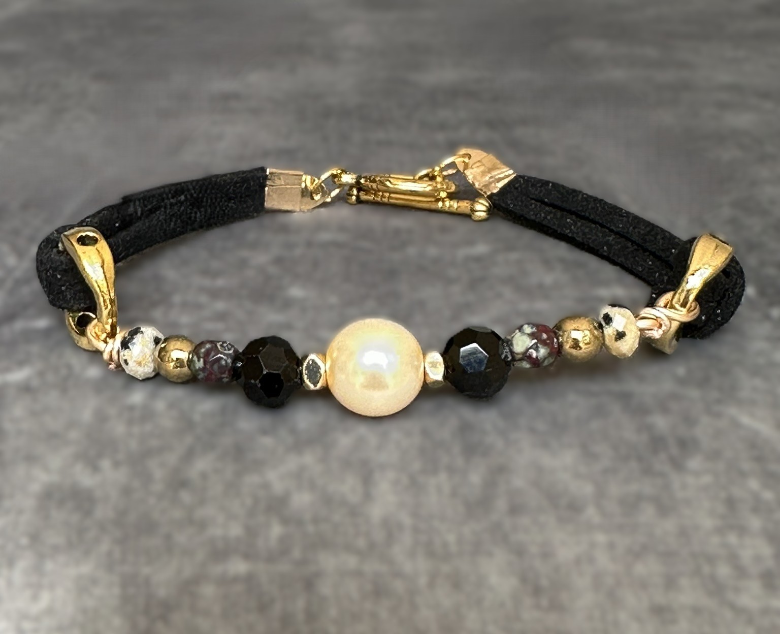 Zwart (faux) suede armbandje met een inzetstuk van zwart-creme gevlekte jaspis, zwart gefacetteerde kralen, goldplated kralen en een faux parel als centerpiece. Een sieraad met een chique uitstraling.