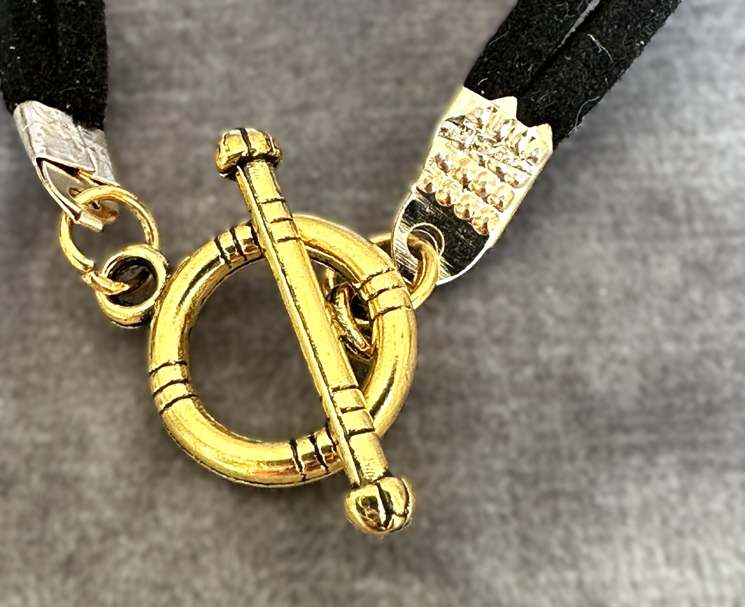De armband sluit gemakkelijk met een zg. ’toggle’. In dit geval een hartje met een staafje.