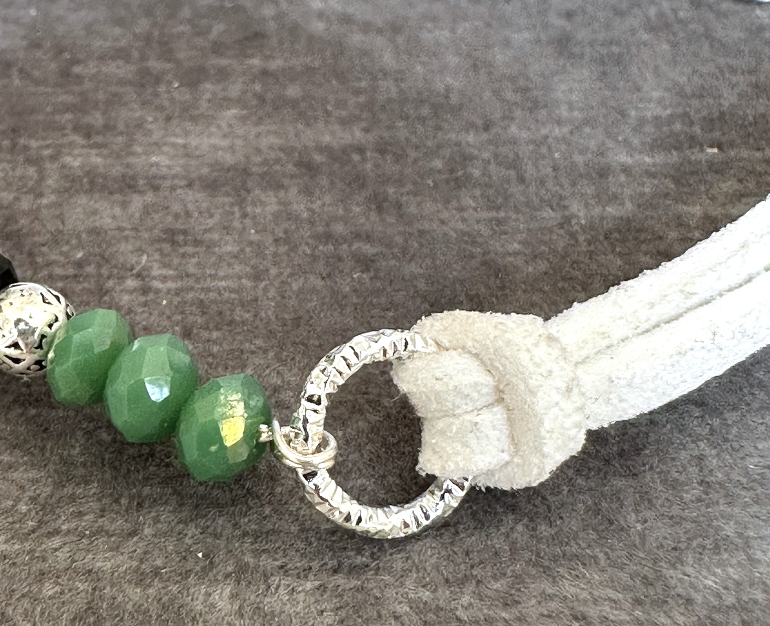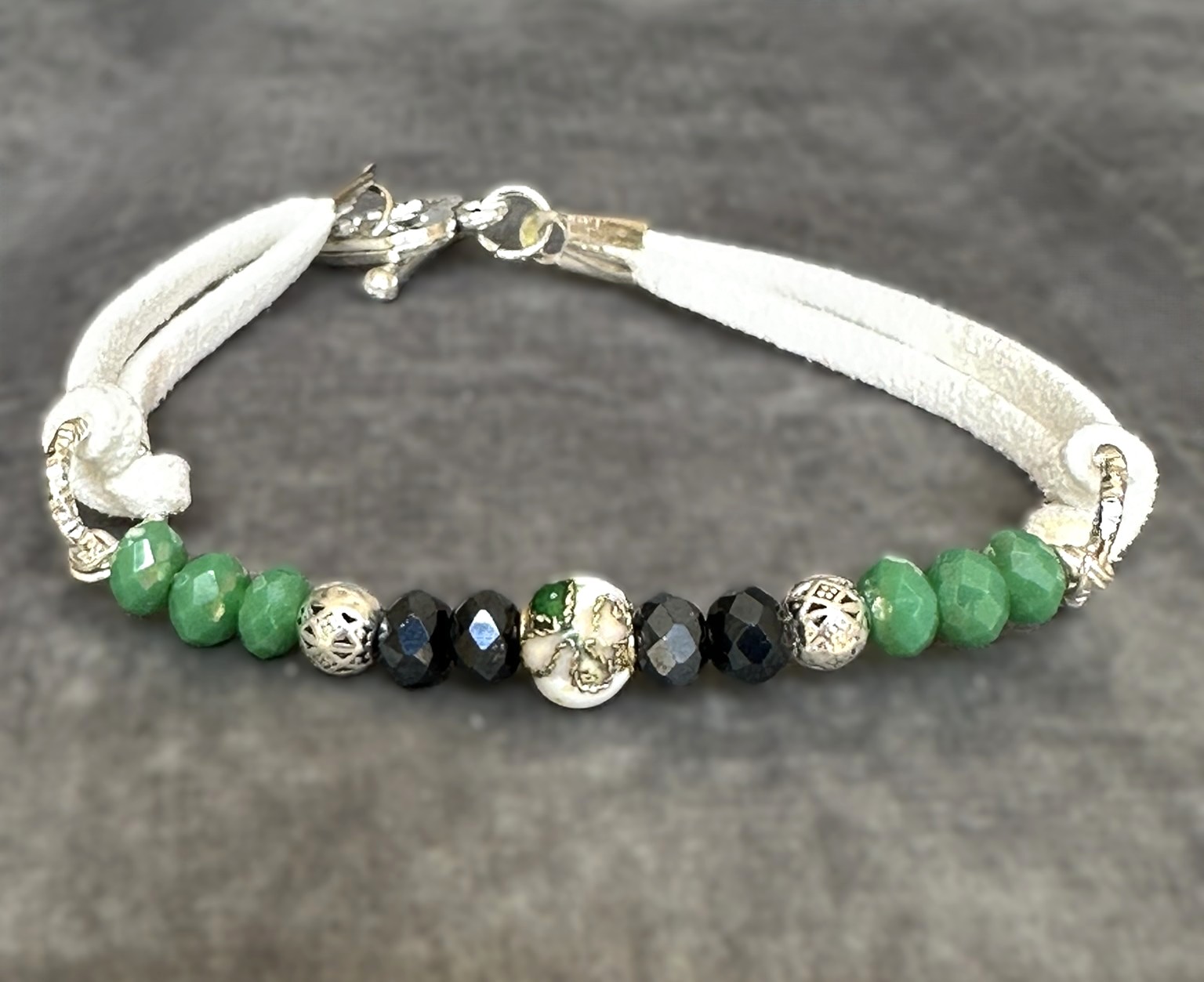 Wit (faux) suede armbandje met een inzetstuk van flonkerende, gefacetteerde zilverkleurige, grasgroene en diepblauwe kralen. In het midden een bijzondere groen-witte emaille kraal.