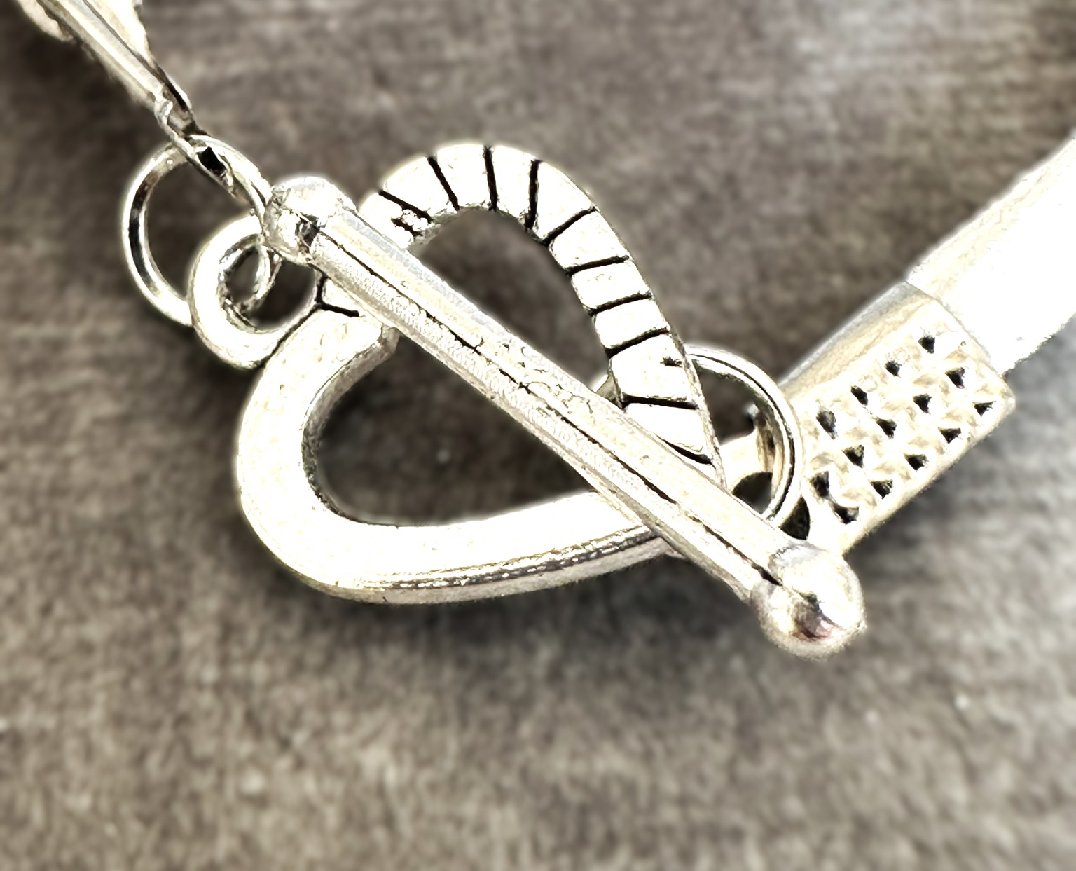 De armband sluit gemakkelijk met een zg. ’toggle’. In dit geval een hartje met een staafje.