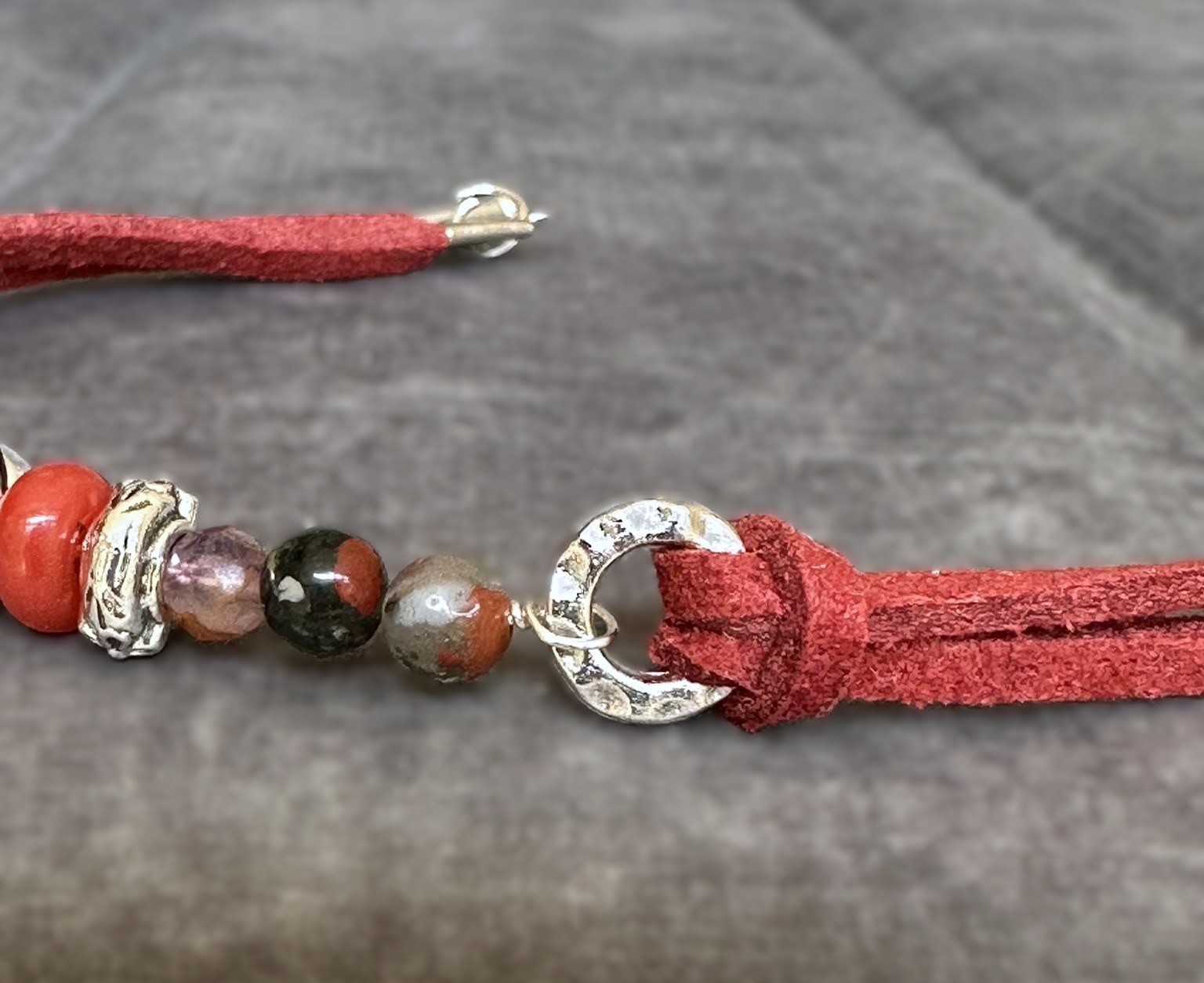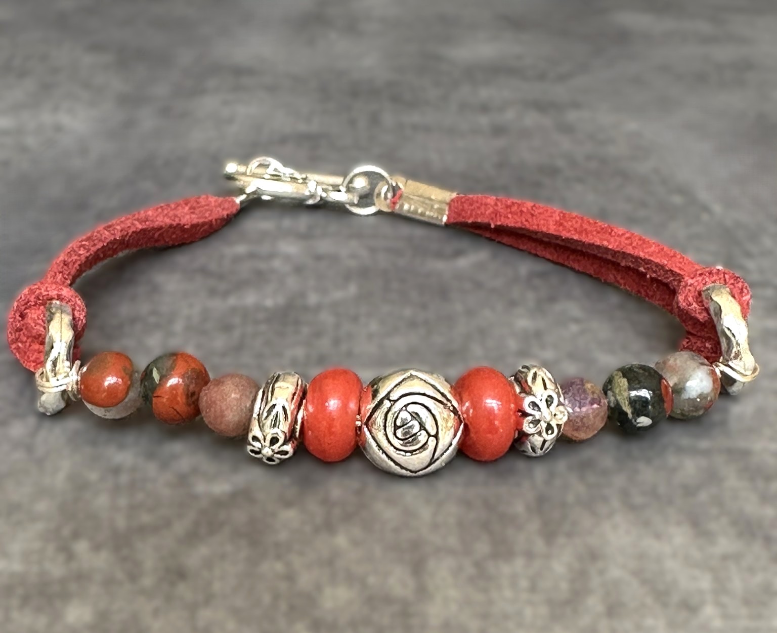 Roodbruin (faux) suede armbandje met een inzetstuk van roodgroene jaspis, rode donuts, ametrine en zilverkleurige kralen, In het midden een roosje.
