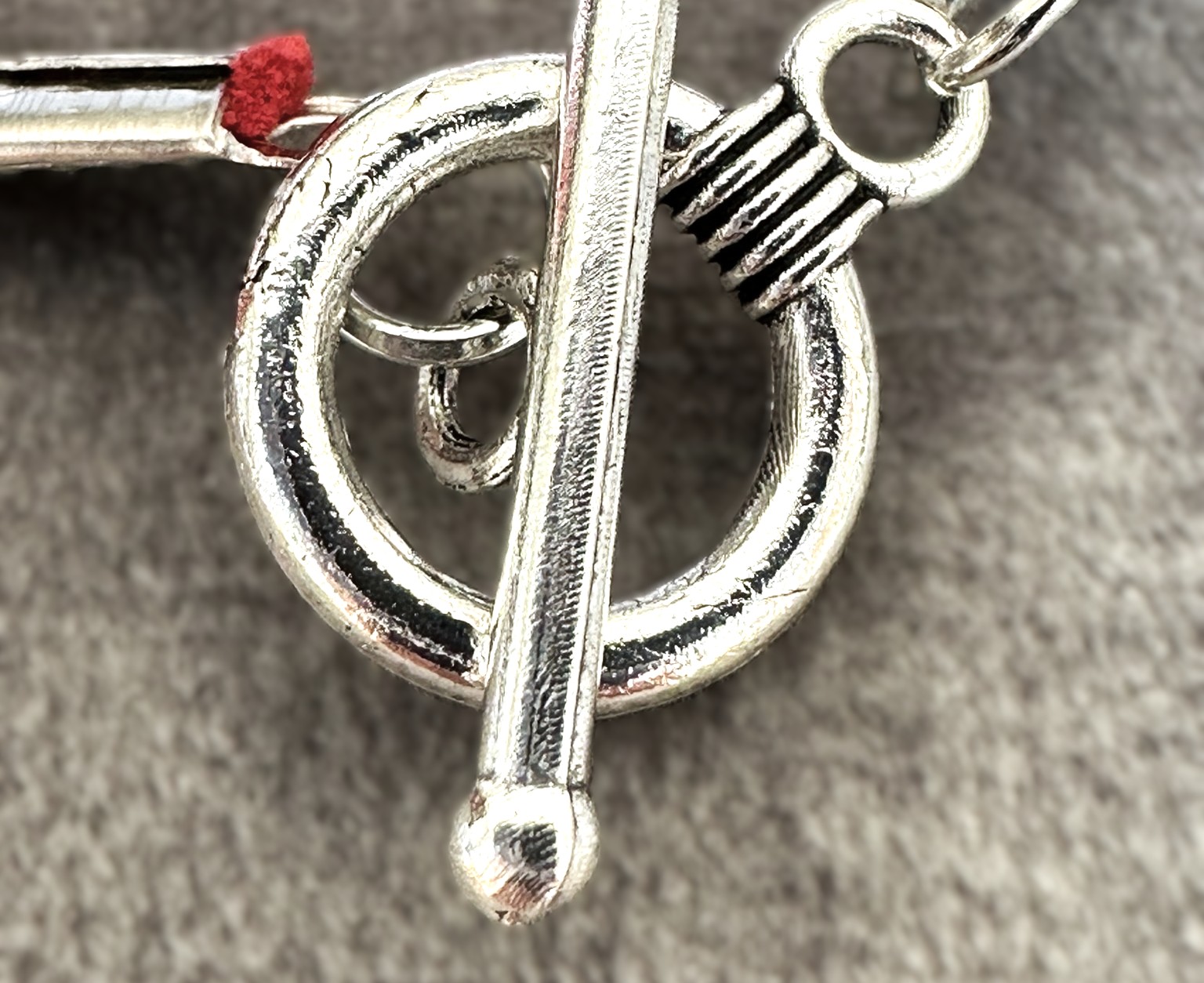 De armband sluit gemakkelijk met een zg. ’toggle’. In dit geval een koperen cirkel met een staafje.