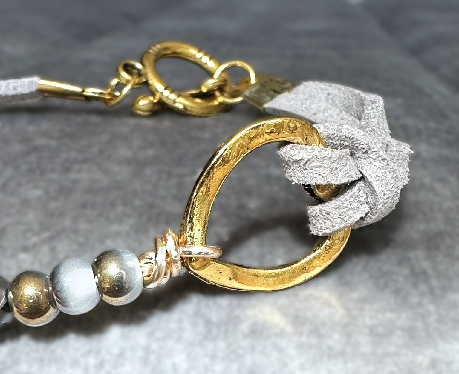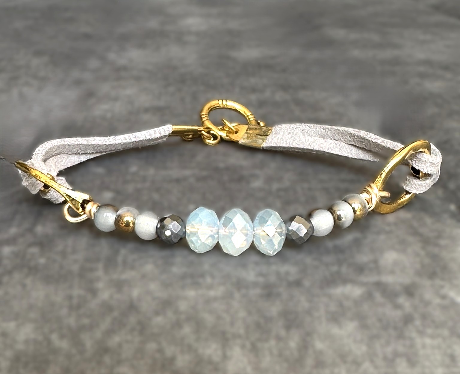Mintkleurig (faux) suede armbandje met een inzetstuk van kralen in classy tone-sur-tone grijs-blauw.
