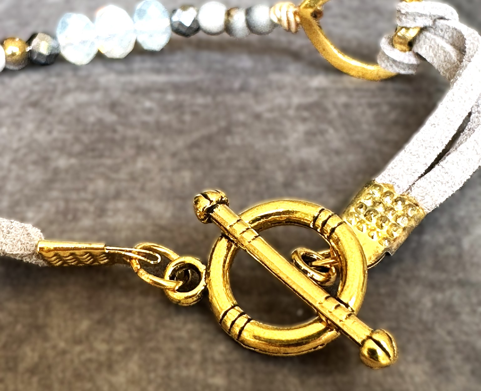De armband sluit gemakkelijk met een zg. ’toggle’. In dit geval een cirkel met een staafje.