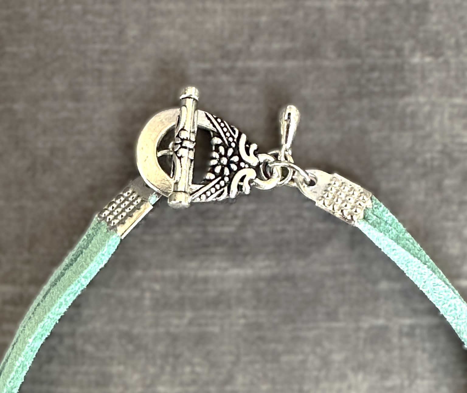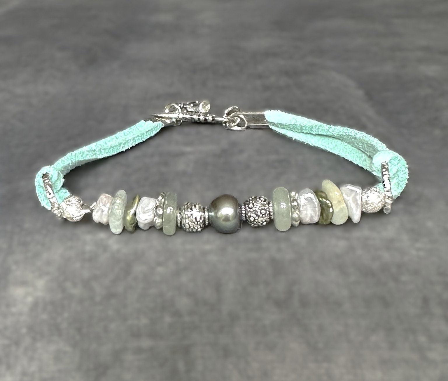 Mintgroen (faux) suede armbandje met een inzetstuk van kralen. In het midden een groen, rond pareltje uit Borneo, geflankeerd door lichtgroene glas donuts, zilverkleurige kralen, amazoniet en keshi parel chips.