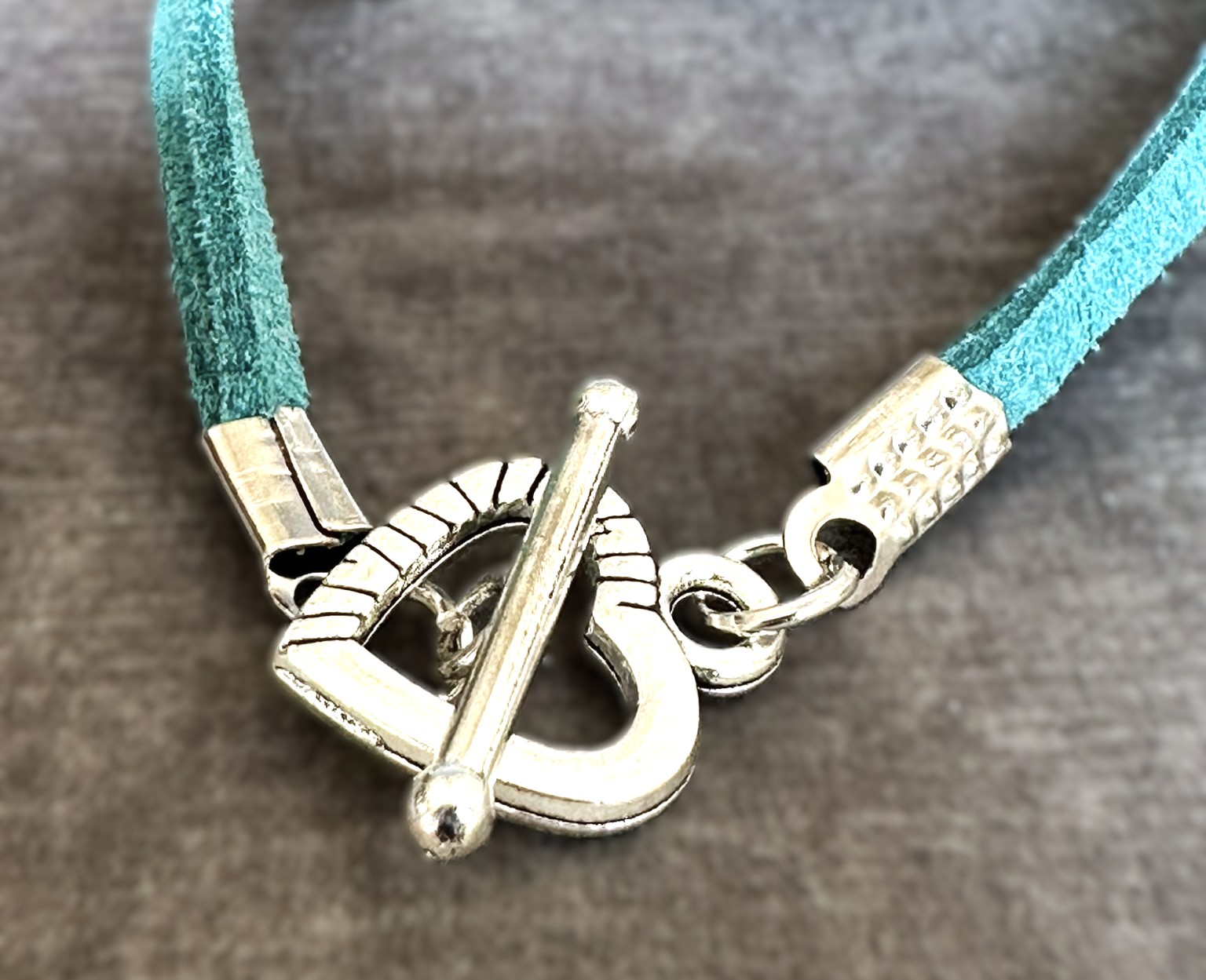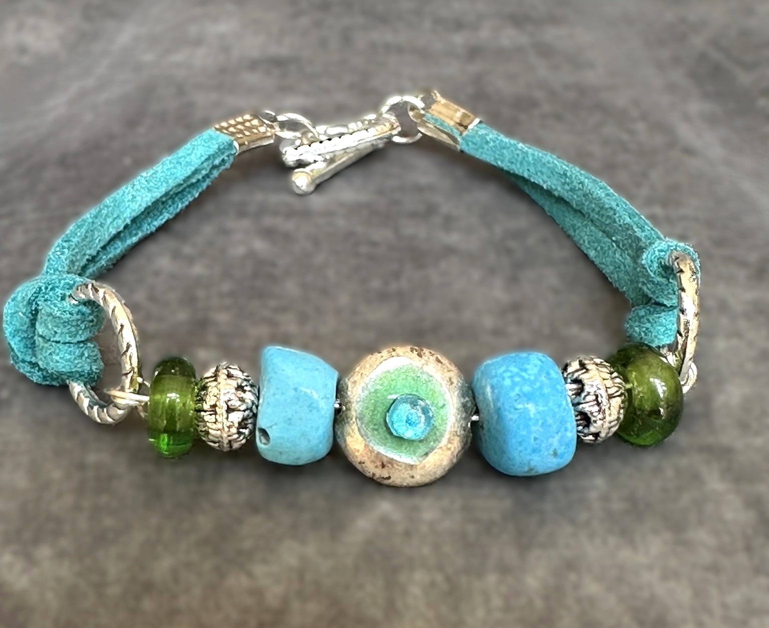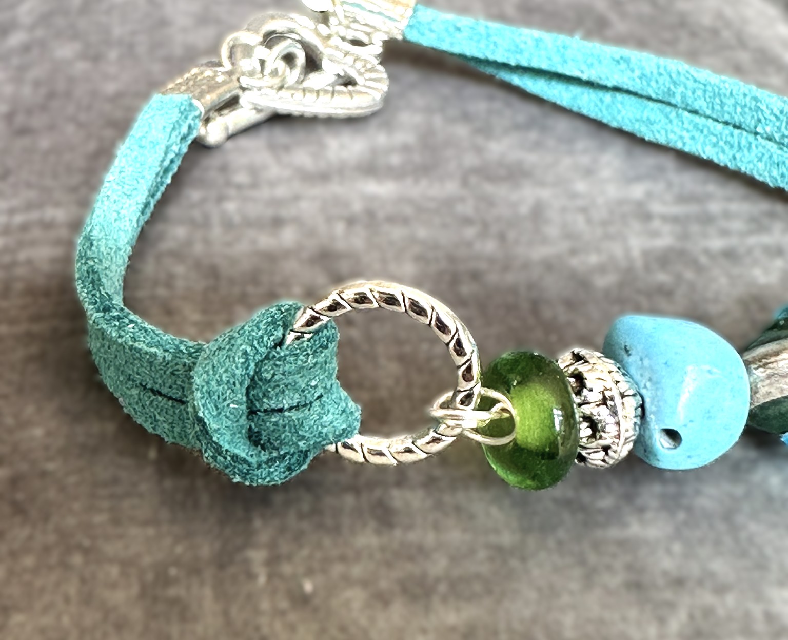 Groenblauw (faux) suede armbandje met een inzetstuk van grasgroene, turquoise en zilveren kralen. In het midden een ‘oogje’ van zilverkleurige kraal met een lichtblauw steentje.